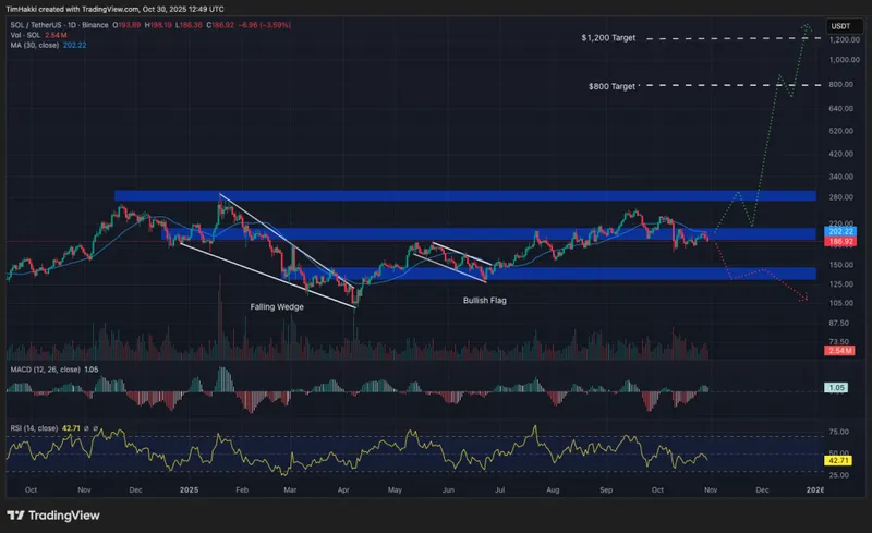 Qwen3-MAX预测,Solana在突破看涨旗形模式后,可能在圣诞节前涨至800至1200美元,这一目标虽然大胆,但在加密友好的美国立法支持下是有可能实现的。