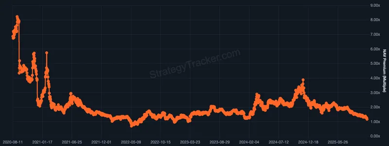 根据StrategyTracker的数据,比特币和Strategy股价的下跌导致其mNAV压缩至1.05倍,较去年11月唐纳德·特朗普赢得美国大选后比特币飙升时的峰值3.89倍有所下降。