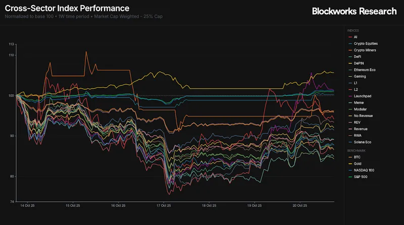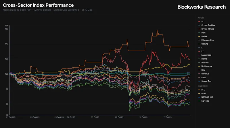 虽然短期内部分板块有所回升,但过去 30 天内,加密货币相关指数整体下跌。10 月 10 日的清算事件导致市场普遍走弱,仅黄金、加密矿工、人工智能和股票指数保持相对强势。