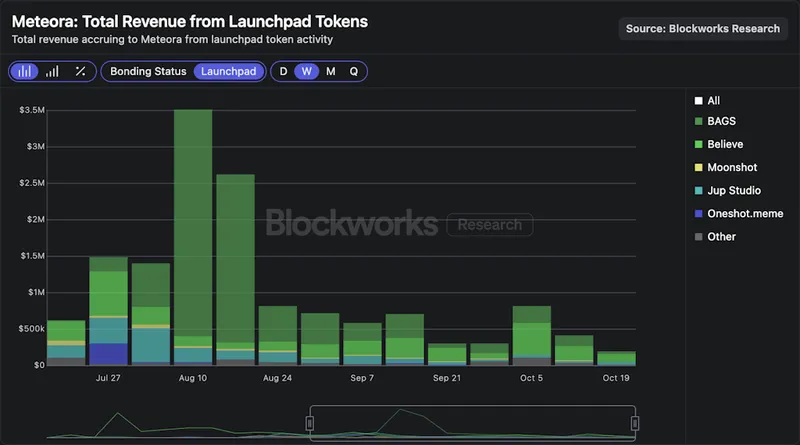 Solana 上的 DEX 通常缺乏前端护城河,Raydium 就曾因 PumpSwap 转移分级代币而损失大量交易量和收入。Meteora 通过与 Jupiter 及 Launchpad 合作伙伴垂直整合,提升分销能力。Jupiter 已成为链上交易的重要入口,Meteora 也与 Moonshot 合作推出 Launchpad,吸引了 Believe、BAGS、Jup Studio 等新伙伴。近期 Launchpad 每周为 Meteora 贡献 20 万至 80 万美元收入,主要来自 Believe 和 BAGS。