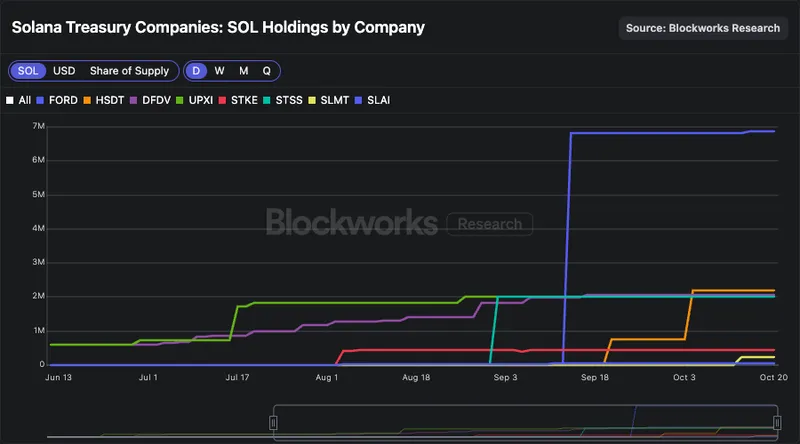 SOL DATCO 的情况则较为复杂。福特公司持股规模最大,主要通过 PIPE 发行获得。尽管已进行 40 亿美元的 ATM 发行计划,但福特尚未通过 ATM 股票实现显著增持。整体持股量增长缓慢,HSDT 最近升至第二位。