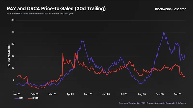 以 Raydium 和 Orca 为可比公司,二者今年以来的 30 天年化市销率在 9 倍左右。ORCA 在各回溯期内市销率约为 6 倍,RAY 近期因收入下滑溢价交易。Meteora 年化收入预估在 7500 万至 1.15 亿美元之间。