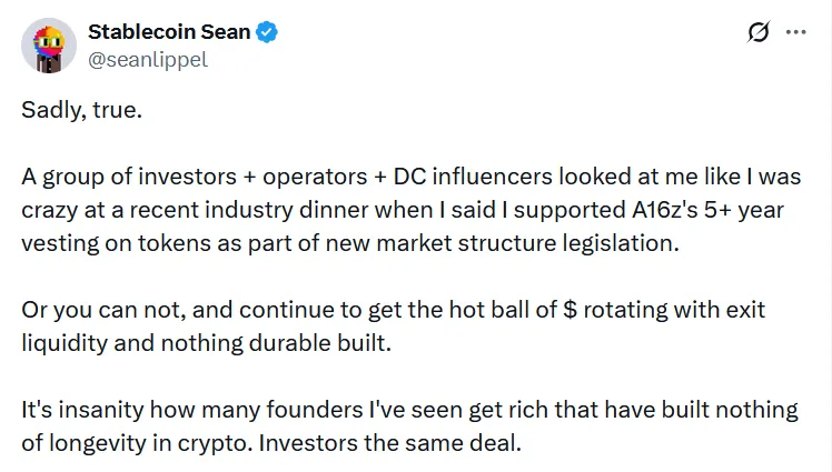 Sean Lippel表示:“在最近一次行业晚宴上,我提到支持A16z提出的新市场结构立法中关于代币5年以上归属期的建议时,周围的一些投资者和意见领袖都觉得我疯了。”他补充说:“我见过太多已经暴富却没有留下任何东西的加密创始人,这种现象实在令人震惊。”