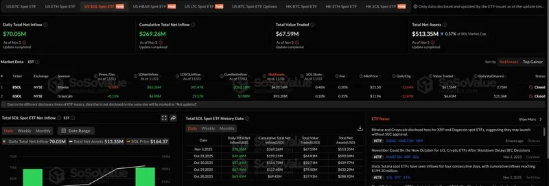 相较之下,现货Solana ETF在11月3日录得7005万美元的净流入,标志着连续第四天的正流入。