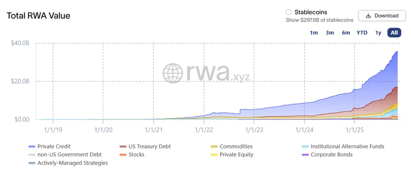 根据行业数据显示,不包括稳定币在内的代币化现实世界资产总价值已达到约366亿美元,其中机构基金约占30亿美元,代币化美国国债约占84亿美元。