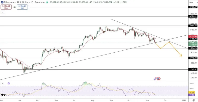 以太坊在本周早些时候跌破了多个月来的上升趋势线,结束了自春季以来支撑每次回调的结构。未能重新夺回接近3500美元的破位区域,使得市场保持谨慎,同时自十月以来的下降趋势线继续限制每次反弹的尝试。
