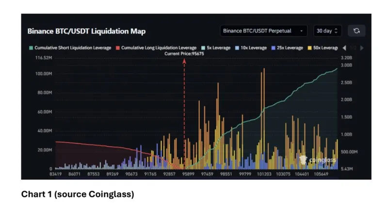 图表1(Coinglass)清晰地展示了这种不对称:短期清算杠杆持续增加,而现货上方的多头杠杆则逐渐减少。Laser Digital表示,“若持续回升至98.5k以上,将是多头的重要确认,并可能引发显著的短期回补。”