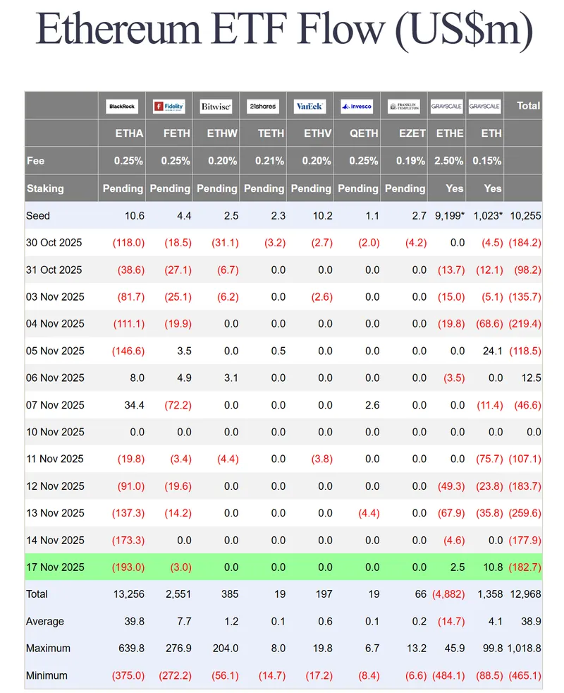 现货以太坊ETF本周一同样遭遇大额赎回,Farside Investors数据显示,当天合计净流出1.827亿美元。其中,贝莱德的iShares Ethereum Trust ETF(ETHA)单日赎回1.93亿美元,成为最大规模的赎回。