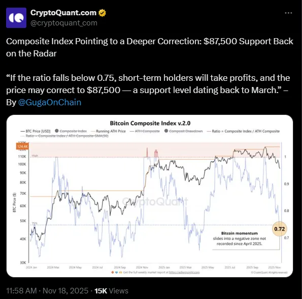 同时,根据分析师GugaOnChain分享的链上数据,市场综合指数降至2025年4月以来的最低水平,这一走势历史上通常会导致更大幅度的回调,暗示比特币可能重回87,000美元区间。