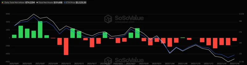 与此同时,美国以太坊ETF也连续第八天出现流出,11月18日流出7522万美元,总净流入回落至128.8亿美元。