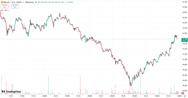 比特币(BTC)自昨日以来上涨1.5%,目前交易价格为91,381美元。