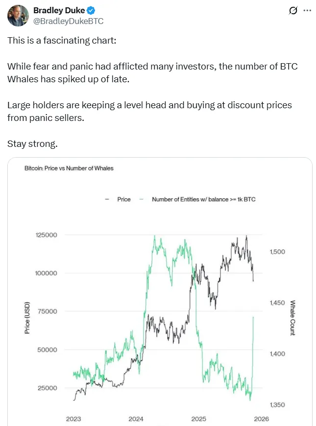 Bitwise Asset Management欧洲区董事总经理Bradley Duke在周三的社交媒体上表示,随着市场恐惧和恐慌情绪加剧,巨鲸正在逢低买入。