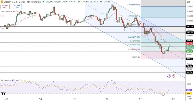 比特币在经历剧烈调整后正在稳定,目前交易价格接近$91,100,经过从$80,542的果断反弹,回到下降通道的底部。这一走势创造了数周以来的首个显著高点,并使比特币回升至$90,798的0.382斐波那契水平。