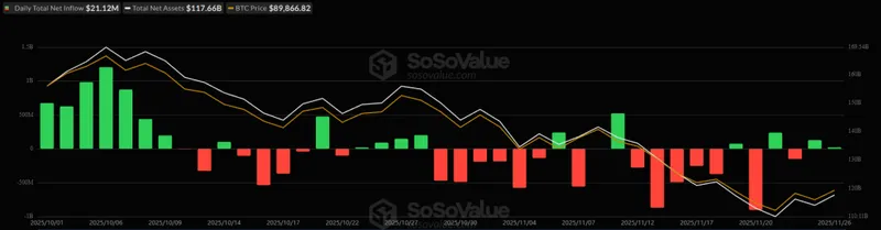 美国比特币现货交易所交易基金(ETF)在11月26日再次吸引了2112万美元的资金流入,使总净流入达到576.3亿美元。
