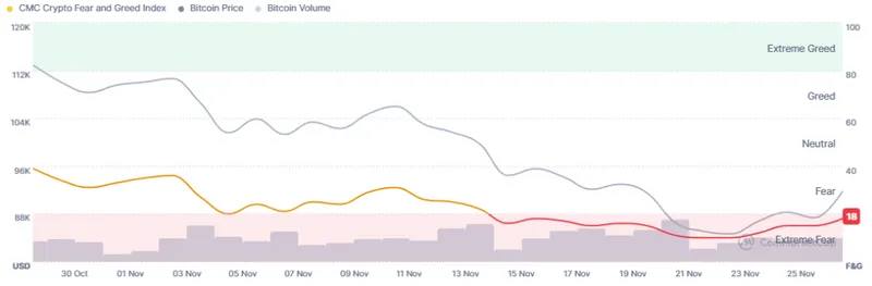 与此同时,加密市场情绪在过去一天略有上升,仍处于极度恐惧区间。当前的恐惧与贪婪指数为18,较昨日的15有所上升。