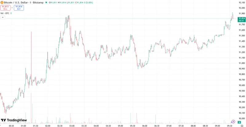 截至周四早晨,比特币(BTC)价格为91,506美元。该币从86,448美元上涨至90,334美元,随后达到91,849美元的日内高点。