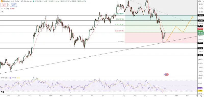 动能正在改善,RSI从32上升至41,与早期恢复阶段相符。图表结构暗示出一个圆形回测:向88,000美元回调,形成更高的低点,随后可能推动价格向98,279美元进发,这与0.382斐波那契回撤位相符。