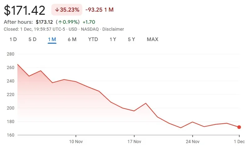 根据Google Finance的数据,行业最大的DAT——Strategy在本月下跌了35.23%,从11月3日的264.67美元跌至目前的171.42美元。