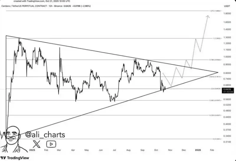 卡尔达诺最近的交易价格约为0.64美元,略高于0.62美元的主要支撑位,该支撑位在过去几个月一直支撑着ADA的走势。该区域与0.5美元的支撑位重叠,构成了一年内的对称三角形形态基础。分析师阿里图表认为,持有高于0.62美元的股票将维持看涨结构,并可能反弹至1.90美元。