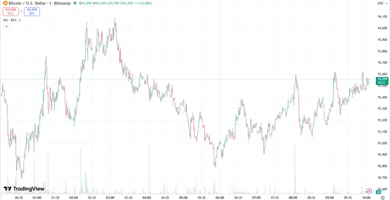 截至周四早上,比特币价格为93,351美元。该币种的交易日波动较大,价格在91,958美元至94,000美元之间波动。