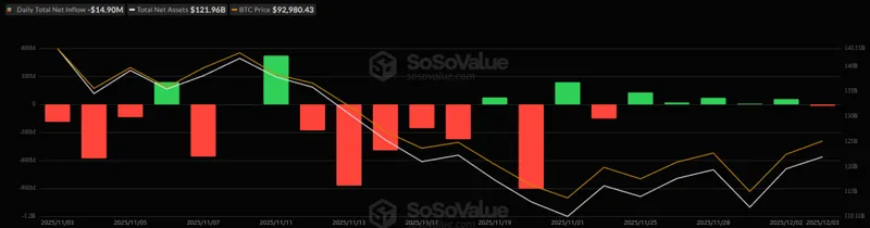 在12月3日,美国比特币现货交易所交易基金(ETF)结束了流入的趋势,录得1490万美元的流出,总净流入略微回落至577.6亿美元。