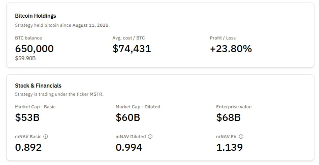 在11月,该公司以自7月以来的最大购买量增加了8,178 BTC,使总持有量达到约650,000 BTC。其基本市值接近540亿美元,企业价值约为690亿美元。