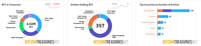 根据BitcoinTreasuries.NET的数据,公共公司财库已持有价值902亿美元的100多万枚比特币,占总供应量的4.7%。