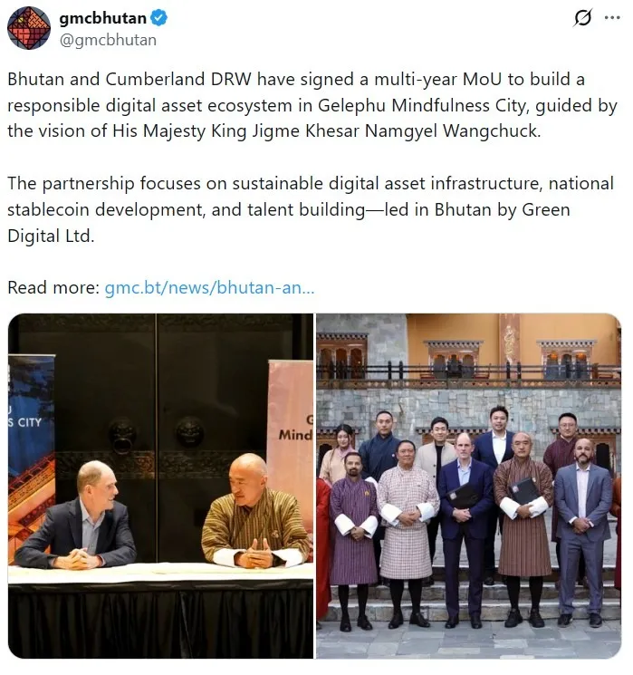 不丹与Cumberland DRW签署谅解备忘录,旨在支持比特币储备管理,并在正念之城Gelephu探索稳定币、挖矿及人工智能计算。