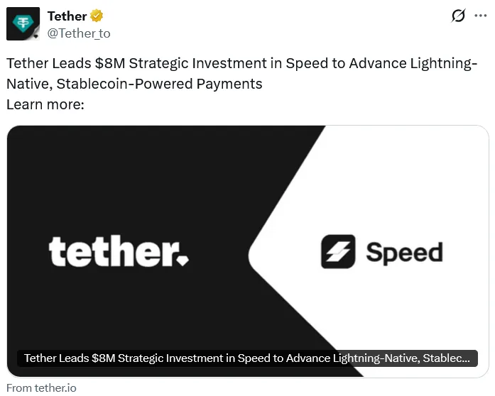 泰达(Tether)最近领投800万美元融资,支持比特币闪电网络初创公司Speed,以推动稳定币在企业支付中的应用。此次投资不仅展示了泰达对比特币生态的持续支持,也反映了其在多个行业的投资布局。