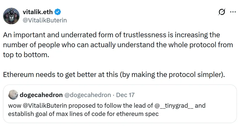 他提到,“增加能够从头到尾理解整个协议的人数是一种重要且被低估的信任共识形式。以太坊需要通过简化协议来提升这一点。”
