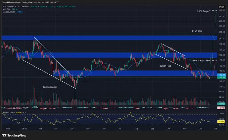尽管市场整体略有回调,SOL仍表现出相对韧性,交易价格接近126美元。如果看涨势头持续,Claude AI预计SOL可能上涨300%,目标价格接近500美元,几乎是1月创下的293美元历史高点的两倍。