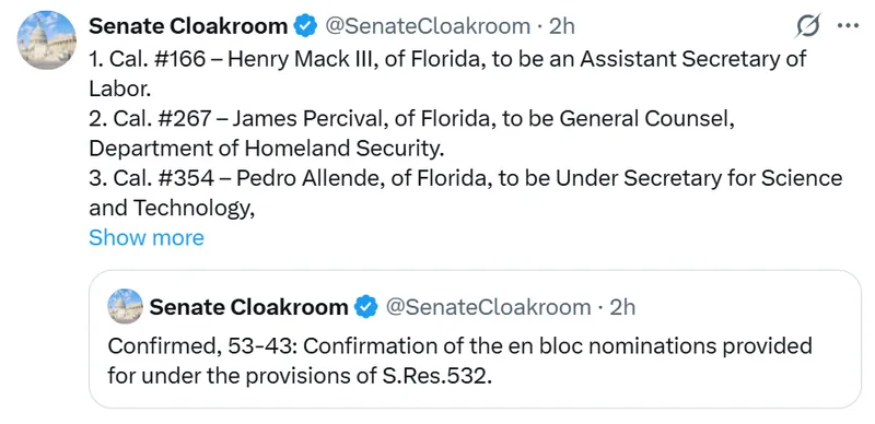 美国参议院已确认Mike Selig担任商品期货交易委员会新任主席,并提升Travis Hill为联邦存款保险公司主席。这两项任命与特朗普政府提名的近100名其他人一起,于周四以53比43的投票结果通过。