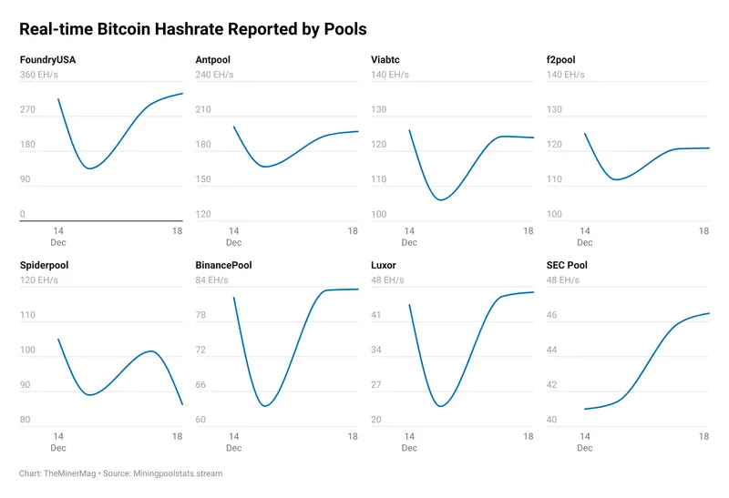 报告指出,大部分主要矿池在短短几天内便恢复至接近下降前的水平,最终净算力下降约20 EH/s,远低于早期报道提到的约100 EH/s损失。报告指出:“这表明我们面对的更多是一次暂时性中断,而非持续性的区域性关停。”