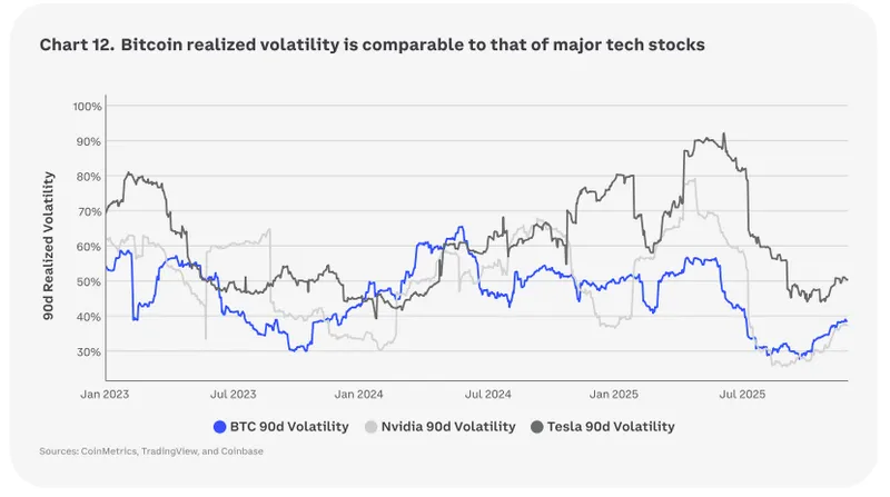 Coinbase指出,比特币(BTC)的90天历史波动率在2025年底已降至约35%至40%,相比2024年中期超过60%的水平有明显下降。值得注意的是,即使市场正在消化包括现货比特币交易所交易基金获批和推出等重大结构性变化,这种波动性的缓和仍然出现了。
