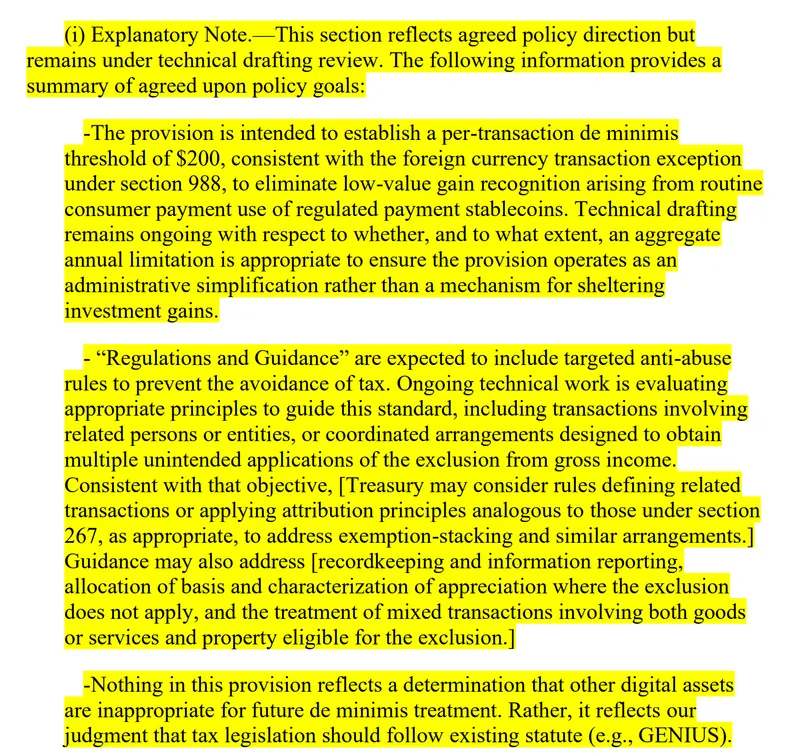 根据草案,只要该资产由GENIUS法案允许的发行方发行、与美元挂钩并维持在接近1美元的窄幅交易区间内,用户在不超过200美元的稳定币交易中无需确认盈亏。