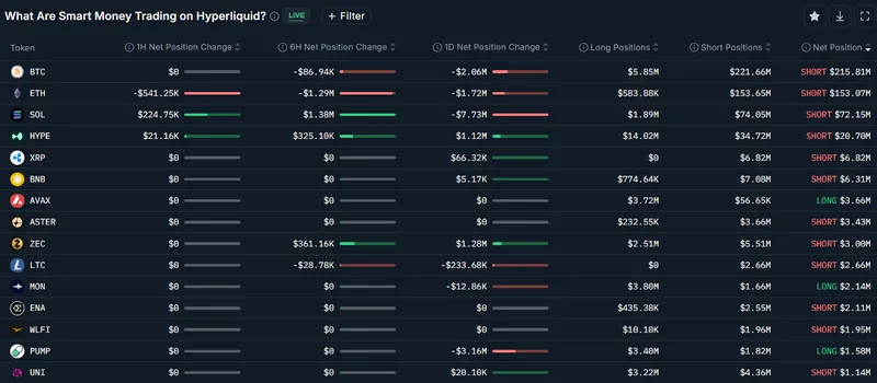 数据显示,除了AVAX代币和迷因币发射平台Pump.fun的代币外,聪明资金在所有顶级加密货币上均持有净空头头寸。