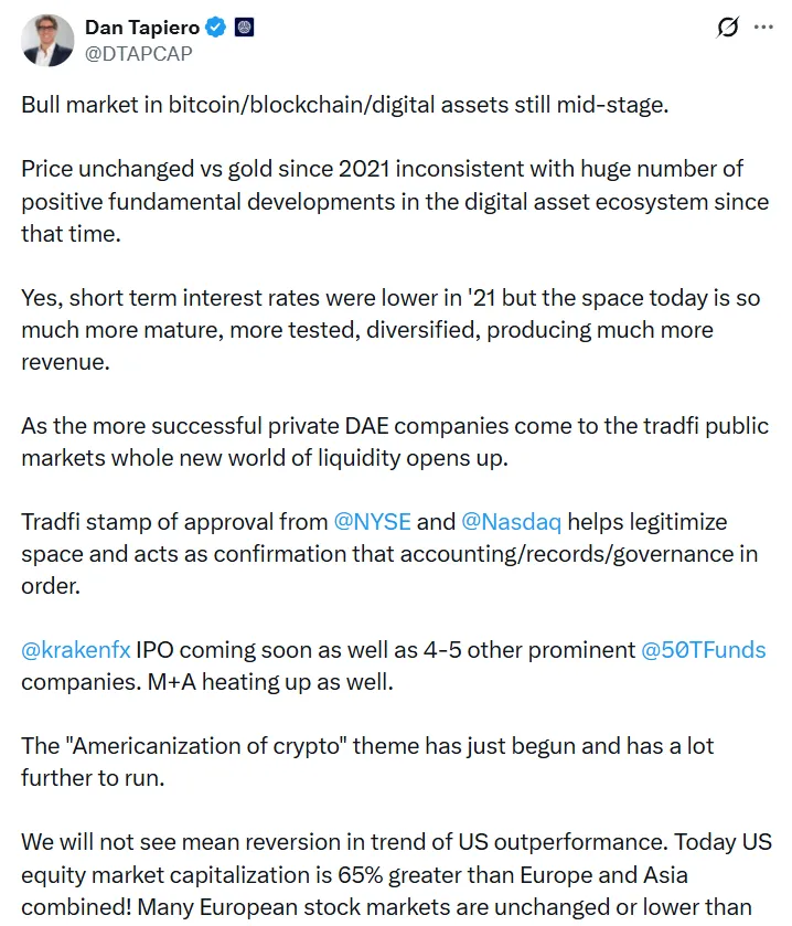 尽管如此,50T Funds的创始人兼首席执行官Dan Tapiero表示,比特币牛市“仍处于中期阶段”。他认为,Kraken的IPO和不断增加的并购交易可能为行业带来新的传统金融资本。