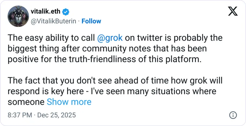 以太坊的联合创始人指出,Grok通过提供与用户政治偏见相对立的反馈,使得X平台更有助于追求真实。