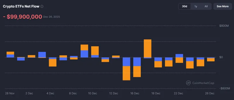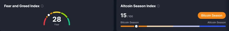 市场情绪紧张,加密货币恐惧与贪婪指数处于恐惧状态,最近的ETF流动数据显示净流出达9990万美元,进一步加剧了短期内的风险厌恶情绪。