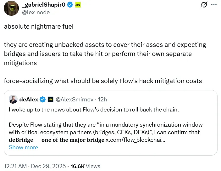 Smirnov抨击了这一“仓促决策”,称Flow未能提前通知生态合作伙伴其计划回滚区块链,并指出链上线回滚所造成的金融损失可能超过原本的攻击事件:“回滚带来系统性问题,影响跨链桥、托管方、用户以及在受影响时间窗口内诚信操作的对手方。”