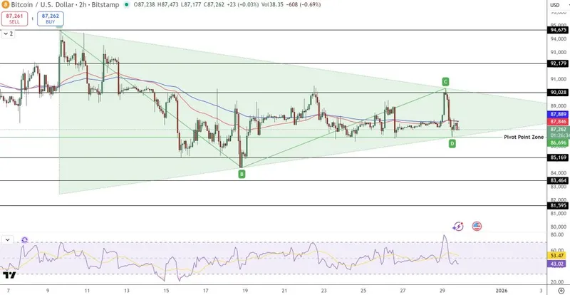 在2小时图表上,比特币的价格预测呈中性走势,BTC在一个明确的对称三角形内盘整,这一经典结构通常预示着大幅度的价格波动。价格持续在上升的下趋势线附近波动,买方在86,700至87,000美元的关键区域持续介入,这一区域作为技术支撑,限制了下行空间。
