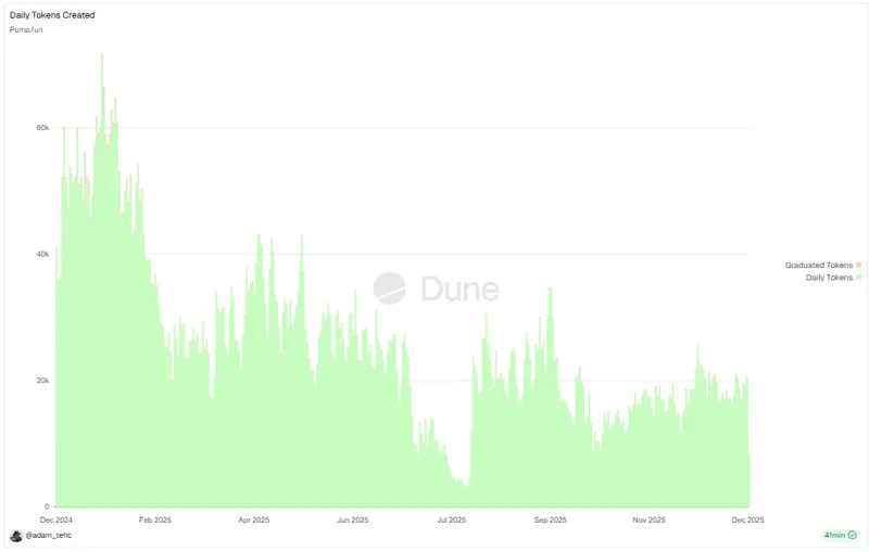 在2025年11月,推出的514,000个代币中,仅有3220个达到了毕业标准。类似的比例在全年持续存在,尽管费用生成仍然强劲,但对可持续性的担忧依然存在。