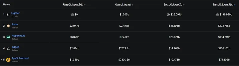 Lighter在DeFi领域的表现突出,DefiLlama数据显示,该平台在过去30天内的永续合约交易量接近2000亿美元,超越了Hyperliquid和Aster等竞争对手。