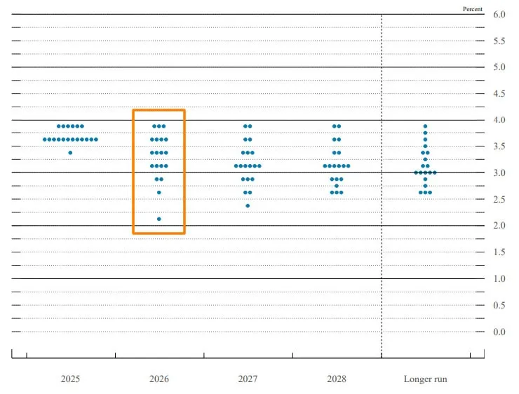 2025年12月公布的点阵图反映每位政策制定者对利率的预测,显示出显著的分歧,许多官员预计零次、一次或两次降息,2026年初市场面临较大的不确定性。