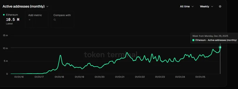 以太坊在2025年第四季度的稳定币转账量达到了8万亿美元,几乎是第二季度的两倍,同时活跃地址和每日交易量也创下了新高。