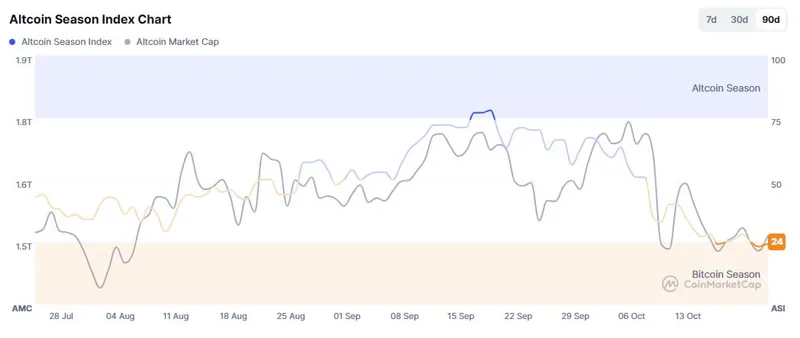 CoinMarketCap的该指数更低,仅为24分,并指出当前仍为“比特币季”;CryptoRank也显示24分,而BitGet的山寨币季节指数为30分。