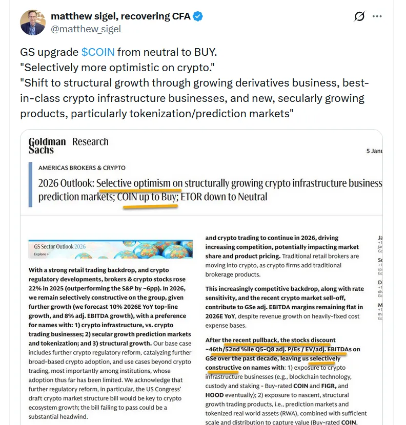 高盛分析师James Yaro在周一的报告中表示,该行对美国经纪商及Coinbase这类“结构性增长的加密基础设施业务”持有“选择性乐观态度”。