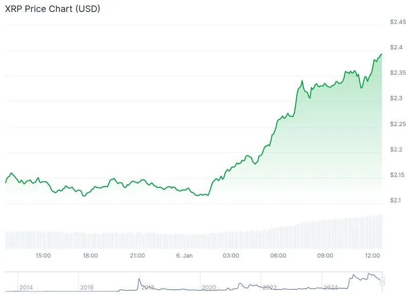以太坊(ETH)日内最高突破3,200美元,创三周多以来的新高;瑞波币(XRP)当日暴涨近12%至2.39美元,达到去年11月中旬以来的最高水平。