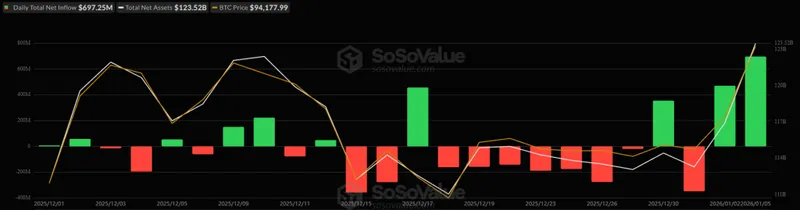 随着新年的到来,第一周的交易开始时表现良好。美国比特币现货交易所交易基金(ETF)在周一录得6.9725亿美元的资金流入,为2025年10月以来的最高水平。总净流入达到了577.8亿美元。