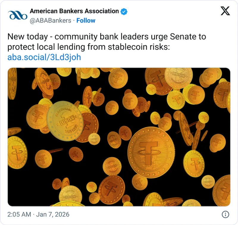 美国银行家协会下属的社区银行家协会在1月5日向参议院递交的信函中指出,必须收紧去年通过的稳定币监管法案,禁止稳定币发行人通过第三方向持币者提供收益。